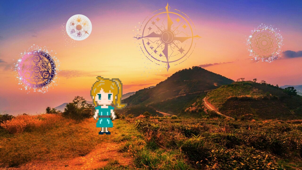 遠くの岩肌には、古代文字のような「目標」「努力」「継続」の文字が刻まれている。
